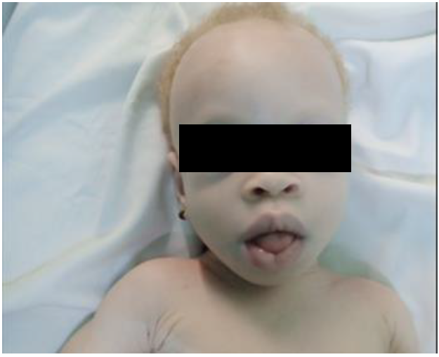 Au plan épidémiologique, il est difficile de déterminer avec précision l’incidence de la maladie de pompe du fait de l’existence de formes tardives [6]. Elle est estimée entre 1/9.000 et 1/40.000 [7]. On distingue généralement deux types en fonction du délai d'apparition des symptômes : la forme infantile (Infantile-Onset Pompe Disease pour IOPD), qui se manifeste avant 12 mois et la forme tardive (late-onset Pompe disease pour LOPD) caractérisée par un délai d’apparition supérieur à 12 mois [8]. La forme infantile est plus sévère avec un pronostic sombre [1]. Elle est plus rarement retrouvée avec une prévalence mondiale estimée à 2 cas pour 100.000 naissances [4]. Sa fréquence varie en fonction des groupes ethniques. Elle est plus fréquente chez les Africains. On l’estime à 1/138.000 dans la population caucasienne et 1/31.000 chez les personnes d'origine africaine [9]. Quelques cas cliniques ont été rapportés en Afrique [6, 7, 9- 11]. Des cas de diagnostic anténatal ont également été rapportés [4]. Le pronostic est sombre marqué par le décès avant le premier anniversaire [6,12]. L'albinisme oculo-cutané (AOC) est un groupe de maladies génétiques héréditaires caractérisées par une déficience de la production de mélanine, le pigment responsable de la couleur de la peau, des cheveux et des yeux. L’association de l’AOC avec la maladie de Pompe n’a pas été rapportée dans la littérature et semble plutôt fortuite. Il est rapporté ici un cas de maladie de Pompe chez un nourrisson de dix mois porteur d’une AOC.