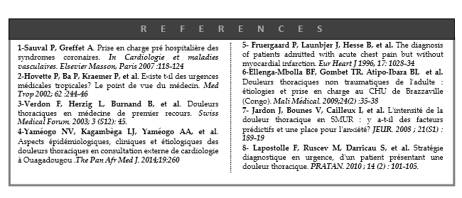 Les douleurs thoraciques non traumatiques sont un motif fréquent et préoccupant de consultation de l’adulte dans les pays occidentaux. Elles sont dominées par les douleurs d’origine cardiovasculaire qui engagent immédiatement le pronostic vital. Dans ces pays, la prise en charge des syndromes coronariens aigus, des dissections aortiques et de l’embolie pulmonaire est bien codifiée [1]. En revanche, en Afrique sub-saharienne, la prise en charge de ces douleurs thoraciques dans les services des urgences reste problématique du fait du retard dans l’acheminement des patients, de l’insuffisance du plateau technique et la pauvreté de la population [2].