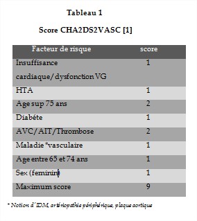 Quelle que soit le type de FA, la mise en route d’un traitement anticoagulant va dépendre selon les recommandations européennes du score de CHA2DS2VASC (tableau I). Si le score de CHA2DS2VASC est strictement supérieur à 1 le patient doit être mis sous anticoagulant.
