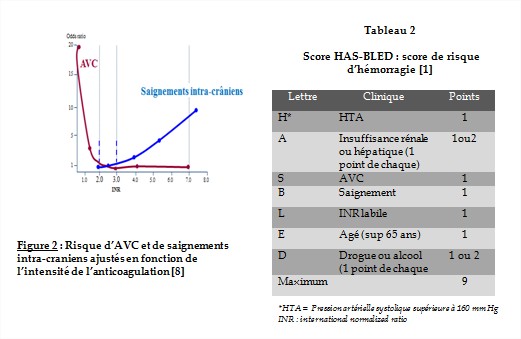 L'urgence d’une anticoagulation chez les patients en FA dépend des facteurs de risque de chaque patient. En général, le risque d’AVC à court-terme (c'est-à-dire, jusqu'à deux semaines) chez les patients en FA est très faible. En conséquence, les patients avec FA stable peuvent recevoir une anticoagulation en ambulatoire (AVK seul), mais un chevauchement thérapeutique par Héparine de bas poids moléculaire-AVK est souhaitable si la FA est instable, le risque embolique élevé (valvulopathie, prothèse valvulaire mécanique, insuffisance cardiaque). La gestion des AVK nécessite le dosage régulier de l’INR. Les cibles d’INR doivent être entre 2 et 3 [9] (figure 2). Un INR en dessous de 2 ne protège pas contre les évènements thrombo-emboliques et au-delà de 3 d’INR, le risque hémorragique est accru sans augmentation de l’efficacité anti-thrombotique. Chez les patients en FA ayant une valve mécanique, il est recommandé de maintenir un INR entre 3 et 4 pour la prothèse mitrale et entre 2,5 et 3,5 pour la prothèse aortique (recommandation de classe I/B).