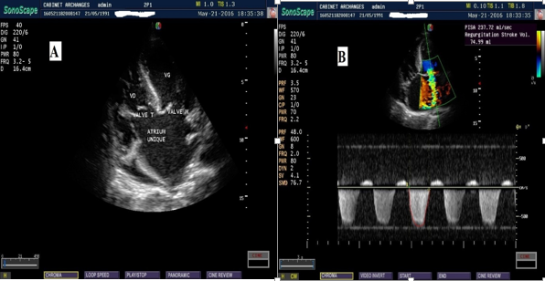 Figure 2 : Images échocardiographiques de l’atrium commun avec en A : une coupe des 4 cavités montrant l’absence de septation atriale et en B : l’atrium commun sur une coupe des 4 cavités montrant également une fuite mitrale importante de 75 ml de volume régurgité (Porto-Novo, 2016).