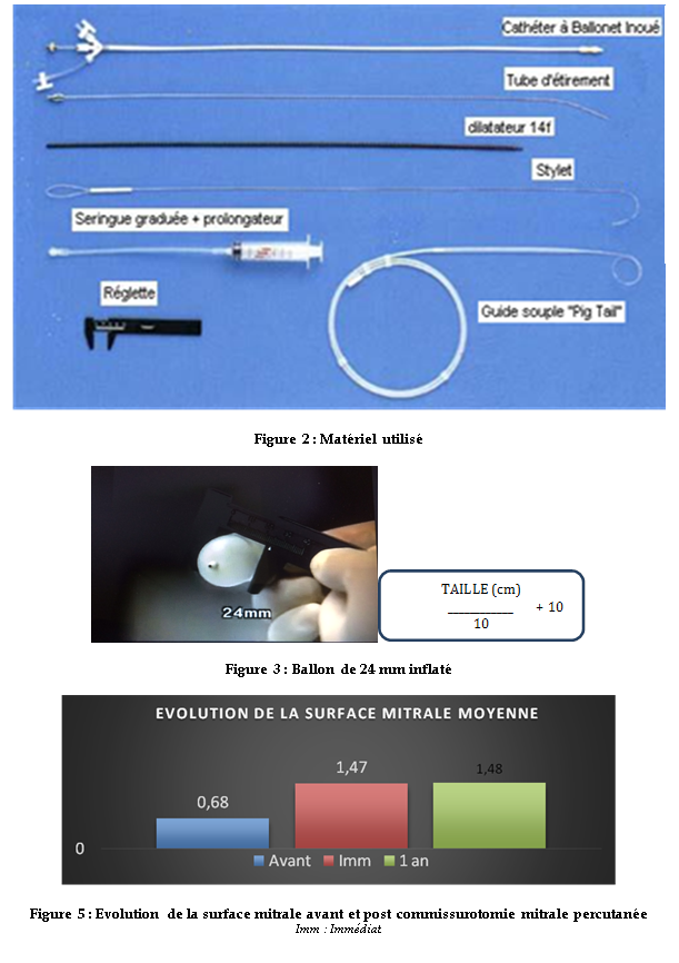 Results: Mean age was 26.68 ± 7.36 years. The sex-ratio was 0.2. A class II to IV (NYHA) dyspnea was presentin100%ofourpatients. Themean diameter of the balloon was of 27.47 ±1.23 mm. Immediately after dilatation Echo-Doppler evaluation showed increase of mitral area from 0.68 cm2 ± 0.15 to 1.47 ± 0.39 cm2(p=9.44e-08) and a reduction in mean trans mitral gradient and systolic pulmonarypressures respectively from16.03 ± 6.83 mmHg to 5.35 mmHg ± 2.03p=1.714e07)and from 73.14 mmHg ± 26.86 to 50.1 mmHg ±18.5(p=2.672e06). None of our patients had a significantmitral regurgitation in post procedure period. After follow up at3, 6 and 12 months, all the patients had clear improvement of symptoms(p=6.232e-07) with stability of the echocardiographic data.