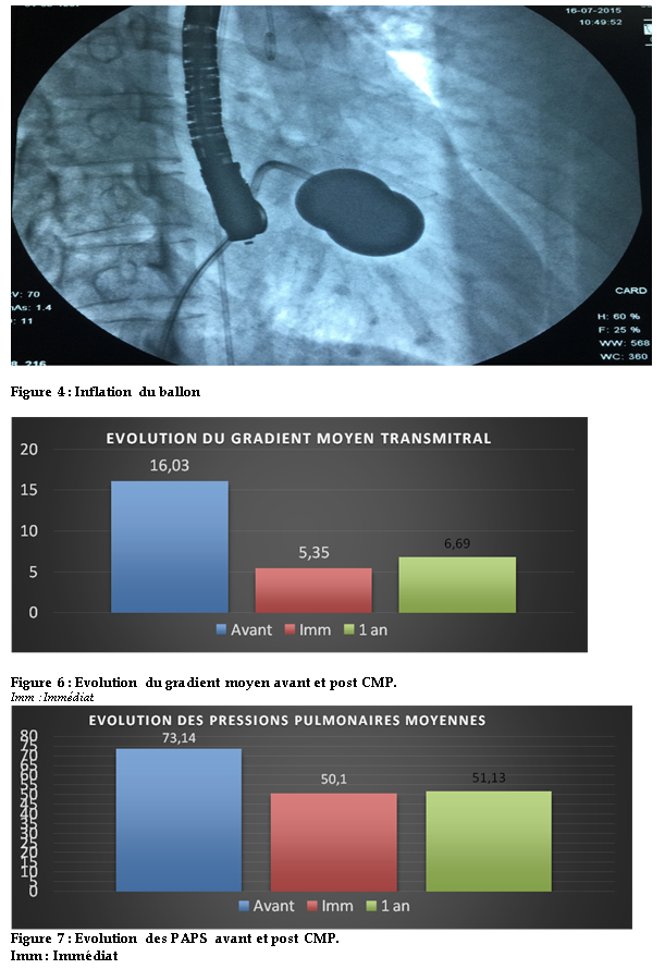 Résultats : L’âge moyen était de 26,68 ± 7,36 ans. Le sex-ratio était de 0,2. Une dyspnée stade II à IV(NYHA) était présente dans 100% des cas. Le diamètre moyen du ballon était de 27,47 ± 1,23 mm. A l’écho-Doppler post procédure, on notait de façon statistiquement significative une augmentation de la surface mitrale (SM) de 0,68 cm2 ± 0,15à1,47± 0,39 cm2, (p=9.44e-08) une diminution du gradient moyen (GM)et des pressions pulmonaires(PAPS) respectivement de 16,03 ± 6,83 mmHg à5,35 mmHg ± 2,03(p=1.714e-07)et de 73,14mmHg± 26,86à50,1 mmHg ± 18,5 (p=2.672e-06). Aucun de nos patients n’avait une fuite mitrale significative en post procédure. Au contrôle à 3, 6 et 12 mois, tous les patients étaient nettement améliorés au plan fonctionnel (p=6.232e-07) avec stabilité des données échocardiographiques.