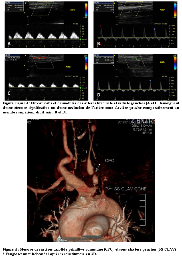 Il y avait par ailleurs à l’écho doppler des membres supérieurs, une sténose significative de l’artère sous clavière gauche à son origine responsable d’un amortissement et d’une démodulation des flux d’aval (figure 3).