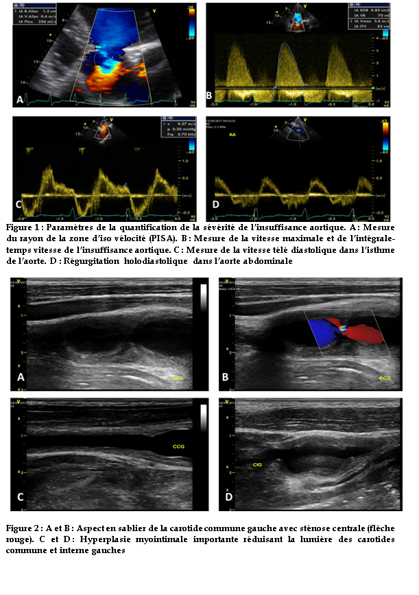 A l’examen clinique, elle présentait un bon état général, sans syndrome infectieux avec un poids de 55 kg pour une taille de 1.55 m. Les pouls périphériques étaient perçus de façon symétriques, amples et bondissants, avec  un élargissement de la différentielle de la pression artérielle à 150/40 mm Hg, constatée aux 2 bras. L’auscultation cardiaque retrouvait des bruits du cœur réguliers avec un souffle holodiastolique 3/6 doux, aspiratif maximum le long du bord gauche du sternum et bien perçu en antéflexion. On ne notait pas de signes périphériques de défaillance cardiaque. Le diagnostic d’insuffisance aortique importante est évoqué,  confirmé par une échocardiographie transthoracique et  une étiologie rhumatismale est suspectée à cette période. Un remplacement valvulaire est  proposé mais non réalisé en raison de difficultés financières. Après trois années de suivi médical irrégulier, la patiente signale des paresthésies du membre supérieur gauche. L’examen clinique notait alors en plus des signes périphériques d’insuffisance aortique, une abolition des pouls radial, ulnaire et brachial du membre supérieur gauche, une pression artérielle non perceptible au bras gauche et un souffle systolique carotidien gauche.