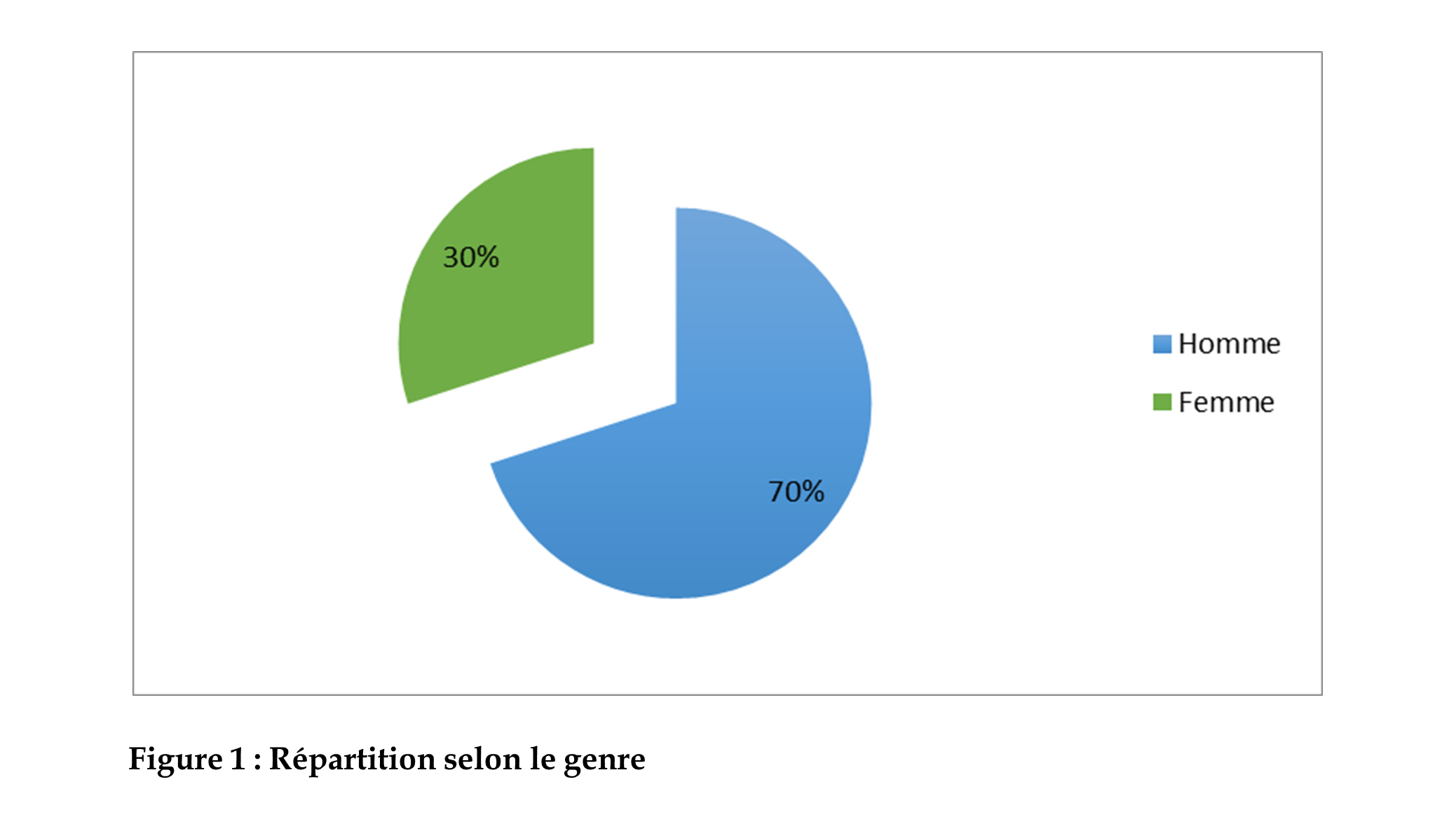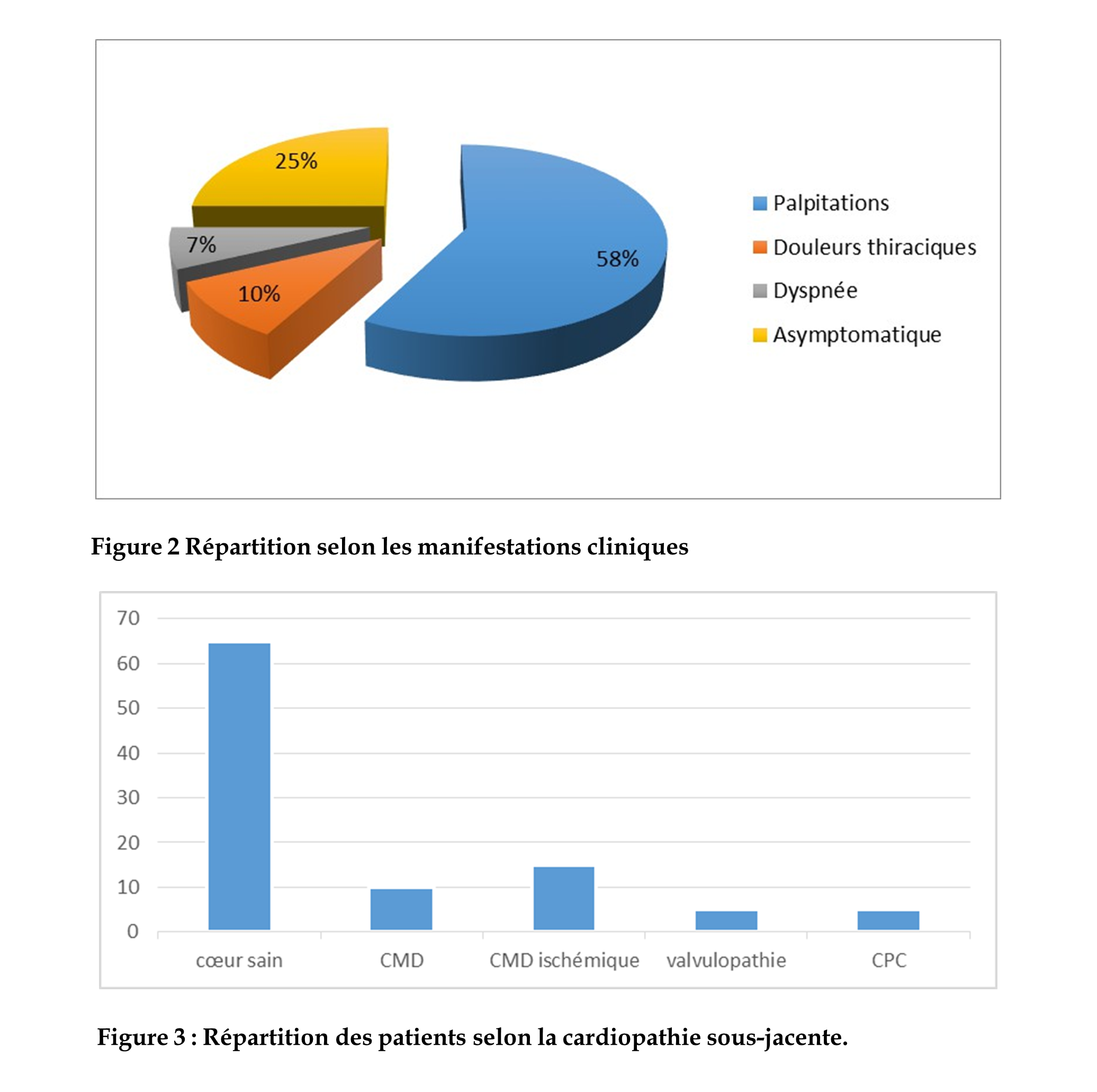 Nous avons colligé durant cette période allant de Juin 2014 à Juin 2020, 133 dossiers de patients présentant un flutter atrial droit sur la base de l’électrocardiogramme de surface. Nous avons noté une prédominance masculine avec 93 hommes et 40 femmes (sex-ratio H/F : 2,32) (Figure 1). L’âge moyen de la population était de 62,3 +/- 12 ans avec des extrêmes de 26 ans et de 85 ans. Les symptômes étaient dominés par les palpitations dans 58% des cas, dans 10% de douleur thoracique, la dyspnée dans 7% des cas et 25% des patients étaient asymptomatiques (Figure 2). Tous les patients avaient bénéficié d’une échographie cardiaque transthoracique. La majorité des patients n’avaient aucune cardiopathie sous-jacente (65% des cas), la cardiopathie sous-jacente la plus fréquente était ischémique dans 15% des cas (Figure 3).