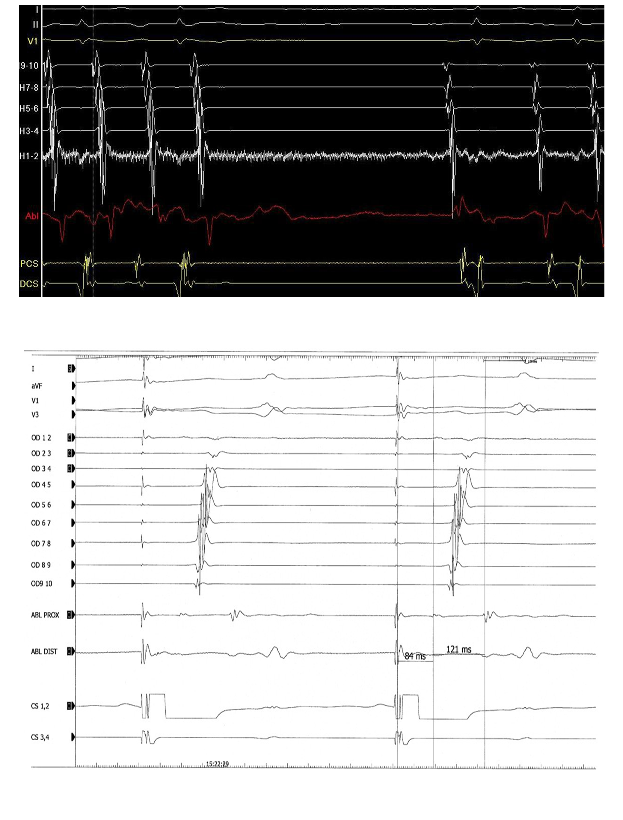 Le succès de l’ablation était confirmé par l’obtention d’un bloc bidirectionnel c’est à dire en stimulant le sinus coronaire proximal, l’oreillette droite basse (proximale) se dépolarisait en dernier et en stimulant l’oreillette proximale, le sinus proximal se dépolarisait en dernier. La mise en évidence d’un aspect de double potentiel sur l’ablation était un argument de succès de l’ablation.