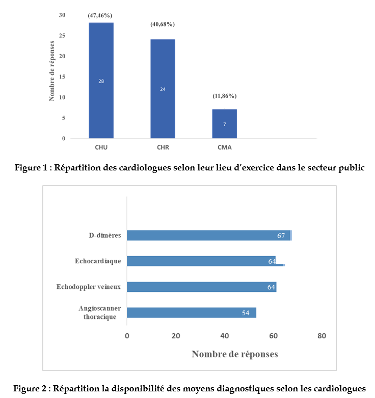Results: Of 93 cardiologists listed, 76 responded to the questionnaire, with a participation rate of 81.72%. Of these, 46 (60.5%) practised in Ouagadougou and 30 (39.5%) outside Ouagadougou. There were 59 public-sector cardiologists (77.6%) and 17 private-sector cardiologists (22.4%). Of the public-sector cardiologists, 47.46% worked in University Hospitals (CHU), 40.68% in Regional Hospitals (CHR) and 11.86% in medical centers with surgical units (CMA). Private practitioners accounted for 58.82%, 35.29% and 5.88% respectively in clinics, polyclinics and practices. Forty percent (40%) of cardiologists said they saw between 5 and 10 patients a month in their practice for VTE, which ranked third among the most frequent pathologies according to 50.77% of responses (33). Almost all cardiologists reported the predominance of VTE among women, and in young subjects under 55 years of age (69.23% of responses). Pulmonary embolism was the clinical presentation most frequently noted by cardiologists, with 68.9% of responses in favor, while the association of PE and DVT was the most frequent, according to 6.8% of respondents. According to 31.1% (23) of responses, the etiological factor was often not found. When this factor was found, prolonged bed rest was incriminated according to 13 cardiologists, or 25.48% of those surveyed. D-dimers assays were available to 67 cardiologists at their place of practice, representing 91.8% of responses. Angioscanner was available to 54 cardiologists (74%). Severe cases were described as very frequent by 8 cardiologists (10.53% of responses). For management, 59 cardiologists (78.67%) used VKAs and AODs. Outside Ouagadougou, the 9 cardiologists (42.86%) practicing there reported the unavailability of AODs at their place of practice.