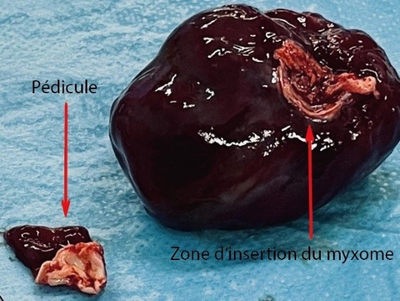 Figure 2: Image macroscopique de la pièce opératoire après exérèse d’un myxome de l’oreillette gauche chez une patiente âgée de 55 ans au Centre National Hospitalier et Universitaire Hubert KOUTOUKOU MAGA (CNHU-HKM) de Cotonou en 2021 (Cas clinique n°1).