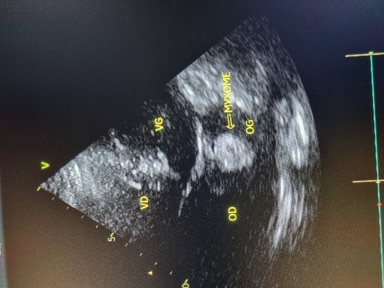 Figure 6: Echocardiographie transoesophagienne en bi dimensionnelle, incidence 4 cavités vue bi-commissurale montrant un myxome appendu à la face atriale de la grande valve mitrale et faisant protrusion dans le ventricule gauche en diastole (Cas clinique n°3). VG= ventricule gauche ; OG= oreillette gauche.