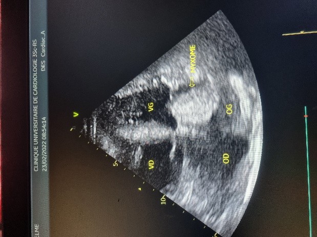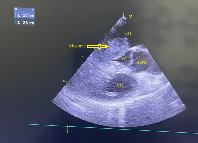 Sa découverte est le plus souvent fortuite (8–10). Lorsqu’elle est symptomatique, la présentation clinique est variable et non spécifique ; elle peut se révéler par des signes d’insuffisance cardiaque ou de complications thromboemboliques (4). Raicea et al en Roumanie et Ndirahisha et al au Burundi ont décrit des cas de myxome révélés par un accident vasculaire cérébral et une insuffisance cardiaque (2,11).