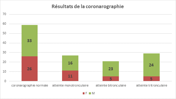 Au cours de la période d'étude, un total de 143 patients répondant à nos critères d’inclusion, ont été sélectionnés dont 96 (67,13%) hommes et 47 (32,87%) femmes ; soit une prédominance masculine avec un sex ratio de 2,04. L’âge moyen des femmes était de 61,40±10,72 ans contre 60,67±10,56 ans pour les hommes. Il n’y avait pas de différence statistique entre les deux sexes (p=0,69). Nous avons constaté que la douleur thoracique typique était prédominante chez l’homme (44,8% vs. 23,40% ; p=0,013). Mais la douleur atypique était plus fréquente chez les femmes (66% vs 41,7% ; p=0,006). La dyspnée d’effort, n’avait pas de différence significative entre les femmes (8,5%) et les hommes (11,5%) ; p=0,77. Une différence significative a été observée dans la présentation de certains facteurs de risque de coronaropathie en fonction du genre. En effet les taux de prévalence de l’obésité (19,1%vs 6,2% ; p=0,038), et de l'hypertension (74,5% vs 54,2% ; p=0,019) étaient significativement plus élevés chez les femmes que chez les hommes. Par contre, le tabac était retrouvé uniquement chez les hommes (7,3% vs. 0%). Les proportions du diabète, de la sédentarité et de la dyslipidémie n’avaient pas montré de différences significatives selon le genre. Les caractéristiques démographiques et cliniques en fonction du genre sont présentées dans le tableau 1 . En considérant les anomalies des examens non invasifs, nous avons observé que 16 patientes (34, 04%) avaient un sous- décalage de ST ; 11 patientes (23,4%) des ondes T négatives et 4 patientes (8,5%) une onde Q de nécrose. A l’exception du sous-décalage, les troubles de la repolarisation n’avaient pas montré de différence significative entre les hommes et les femmes. Nous n’avons pas relevé de particularités par rapport aux données échocardiographiques, mais la proportion de femmes avec des anomalies à l’échocardiographie d’effort était plus importante (21,3% vs. 4,2% ; p=0,004). Les résultats des examens non invasifs sont présentés dans le tableau 2. Les paramètres biologiques n’ont pas révélé de différence significative entre les deux sexes, à l’exception de la créatinémie avec une moyenne masculine légèrement supérieure ; 11,70 ± 2,40 vs. 10,71 ± 22,59 ; p=0,03 (tableau 3 ). Sur les 143 patients de notre série, 84 patients avaient des lésions coronaires et 59 avaient des artères indemnes de lésions ou des artères avec lésions non significatives. La figure 1 résume les résultats de la coronarographie en fonction du genre. Les hommes étaient plus susceptibles d'avoir une atteinte bitronculaire (24% vs.10, 6% ; p=0,05) et tritronculaire (25% vs. 10,5% ; p =0,04) par rapport aux femmes. Par contre celles-ci étaient plus susceptibles d'avoir une coronarographie normale (55,3% vs. 34,4% ; p=0,04). Dans notre étude, l’hypertension était le seul facteur de risque corrélé à la présence de lésions sténosantes chez la femme (81%vs.55, 6% ; p=0,04). Le tableau 4 montre l’incidence des facteurs de risque traditionnels sur la présence de lésions sténosantes en fonction du genre. La distribution de la sténose dans différentes artères coronaires avait été aussi comparée chez les deux sexes. L’artère interventriculaire antérieure (IVA) était la plus touchée dans les deux sexes ; suivie de la Coronaire droite (CD) et de la Circonflexe (Cx). Une sténose de l’IVA avait été observée chez 59 hommes (61,45%) contre 17 femmes (36,20%) ; 1a sténose de l'artère coronaire droite était présente chez 50 hommes (53,76%) contre 18 femmes (38,3%). Au niveau de la Circonflexe, une sténose a été observée chez 49 hommes (51,04%) contre 13 femmes (27,66%). Par rapport au degré d’obstruction des artères, nous avions observé que les lésions serrées (52,1% vs. 25,5% ; p=0,003) étaient plus retrouvées chez les hommes. Les résultats des données angiographiques sont résumés dans le tableau 5. Après l’évaluation angiographique, les hommes avaient plus bénéficié d’une revascularisation par angioplastie que les femmes avec les proportions respectives de 33,34% (n=32) contre 10,64% (n=5) des cas, p=0,02. Par contre les femmes avaient été plus recommandées pour un traitement médical : 89,36% (n=42) contre 66,66% (n=64).
