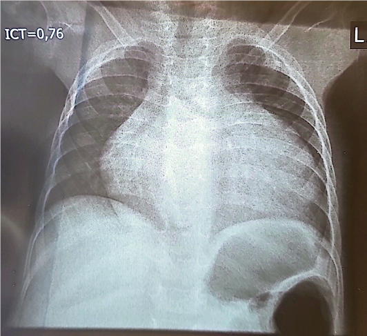 Il y avait une cardiomégalie (figure 2) avec un Index Cardio Thoracique (ICT) à 0,76, sans présence de troubles ventilatoires.